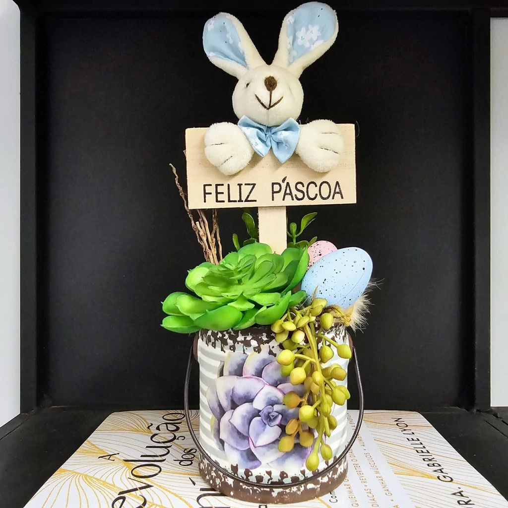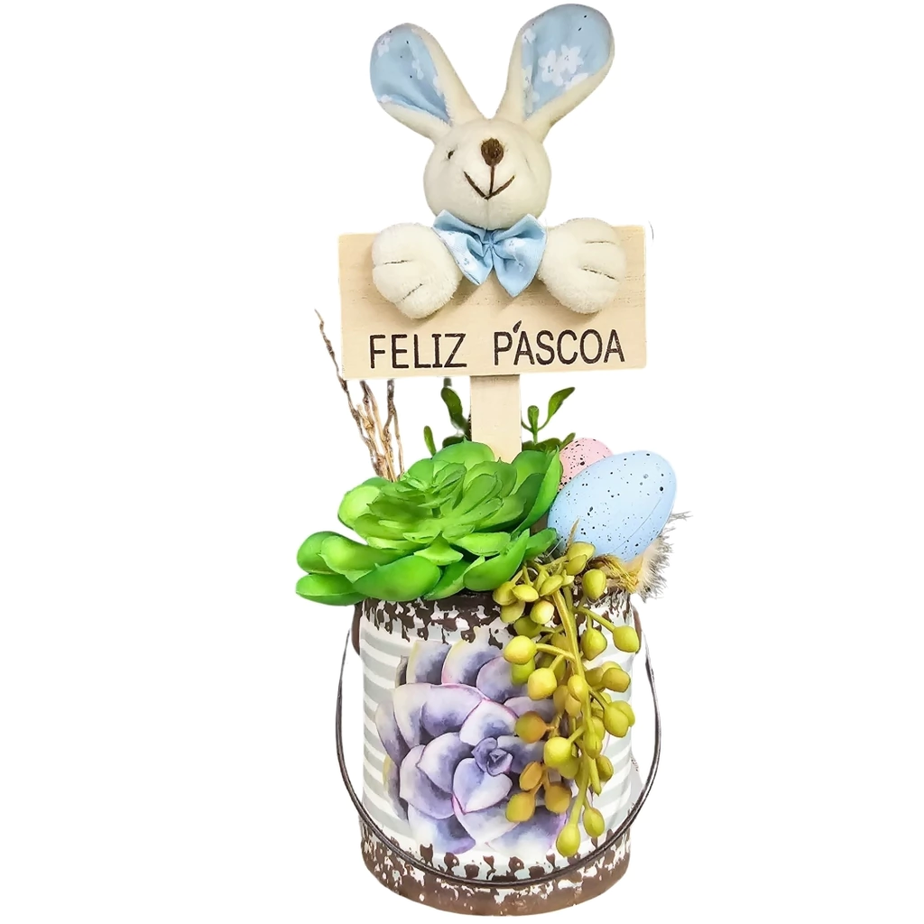 Esse arranjo de páscoa é perfeito para compor a sua decoração de páscoa, podendo ser usado como centro de mesa, no aparador, estante ou mesa de centro. É composto por vaso em cerâmica com plaquinha de coelho, suculenta, ovos, e folhagens formando um lindo jardim!