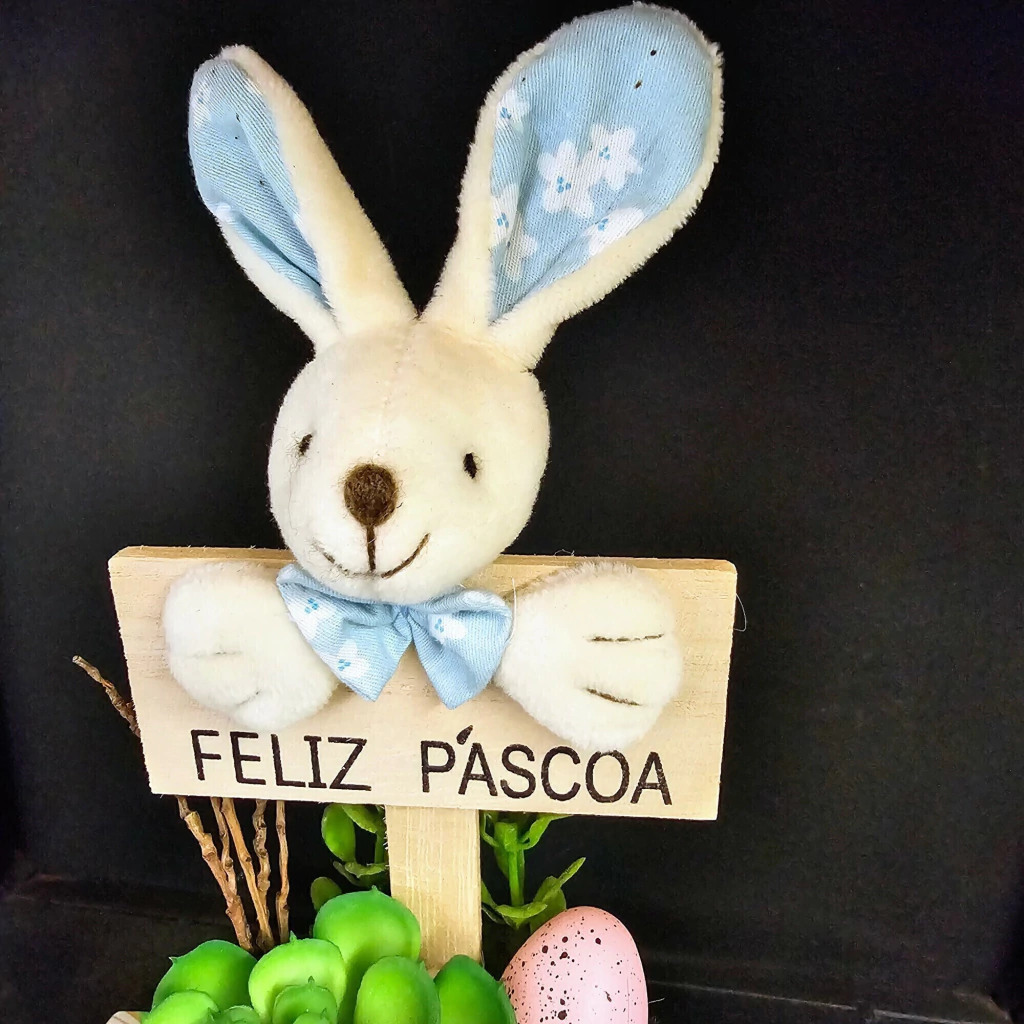 MATERIAL: vaso em cerâmica, placa de mdf com coelho em tecido, flores e folhagens artificiais de plástico e ovos de páscoa em plástico.