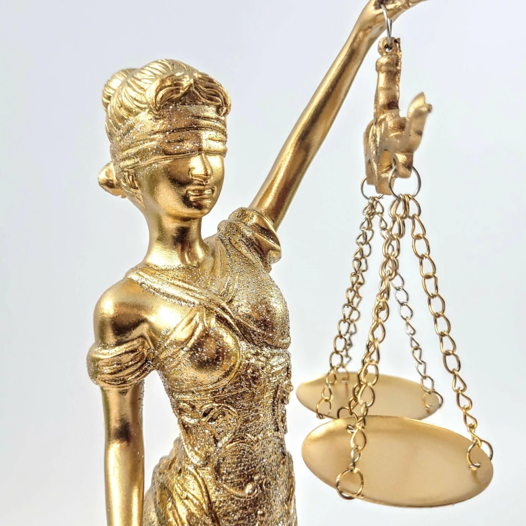 Símbolo de Equidade: Esta linda peça retrata a icônica personificação da justiça, com sua venda nos olhos, balança e espada, simbolizando imparcialidade, equidade e proteção.