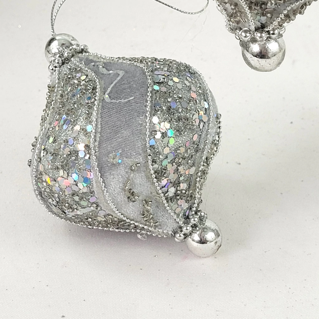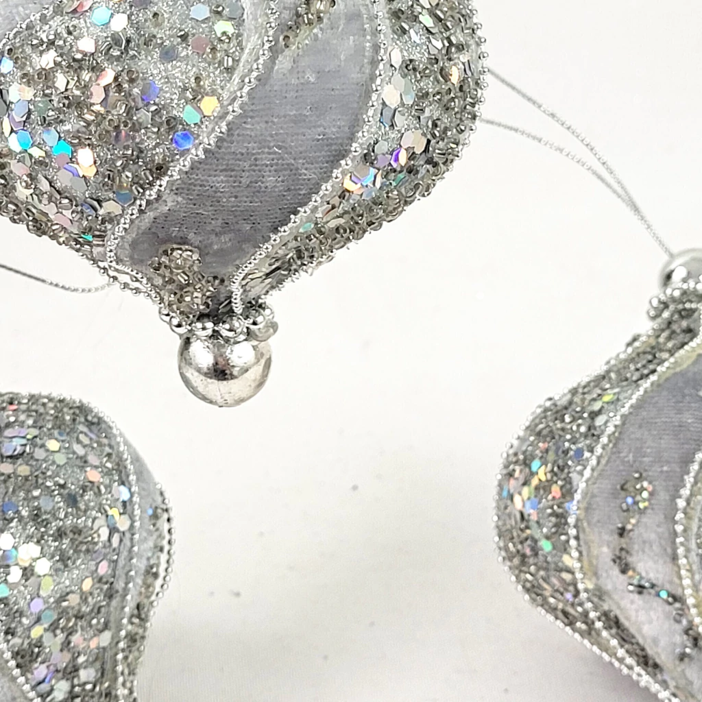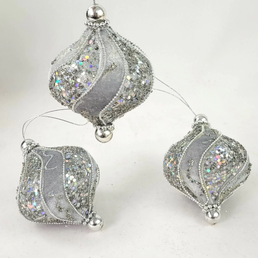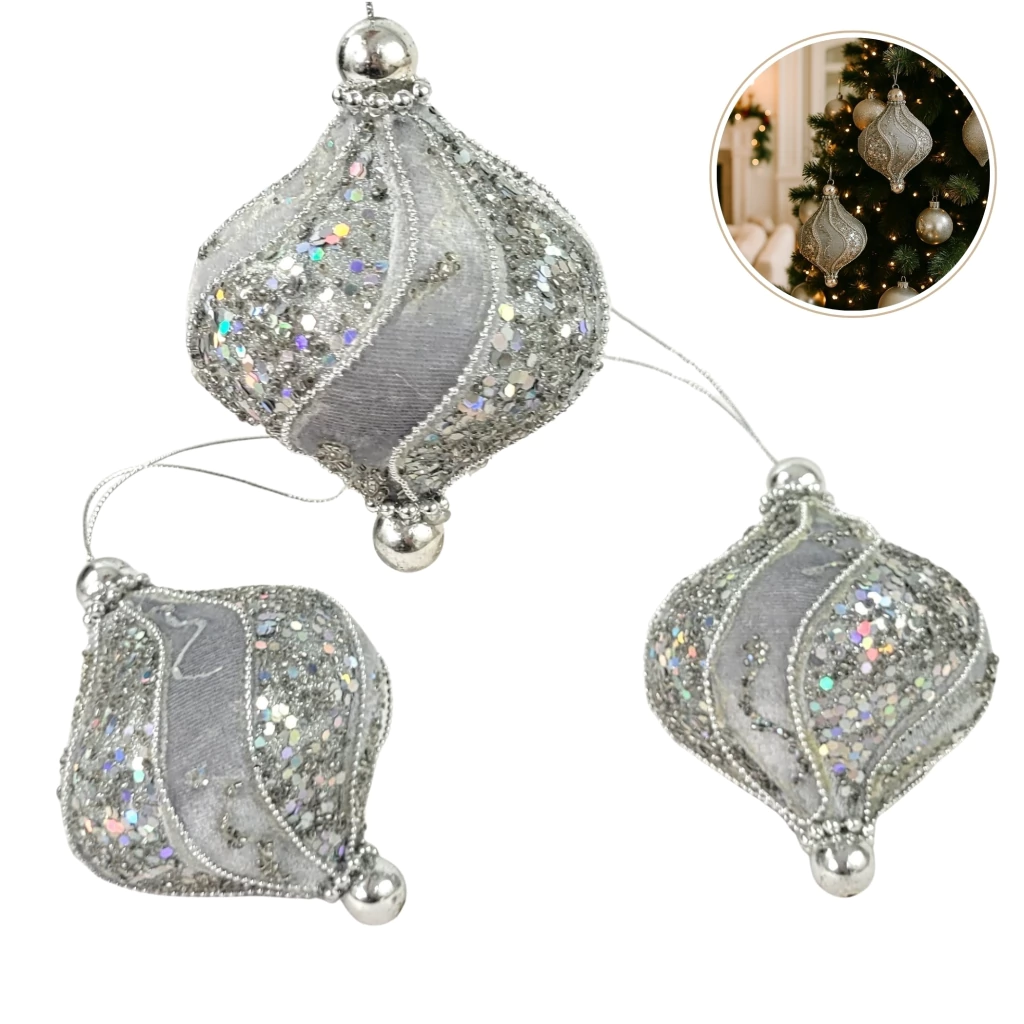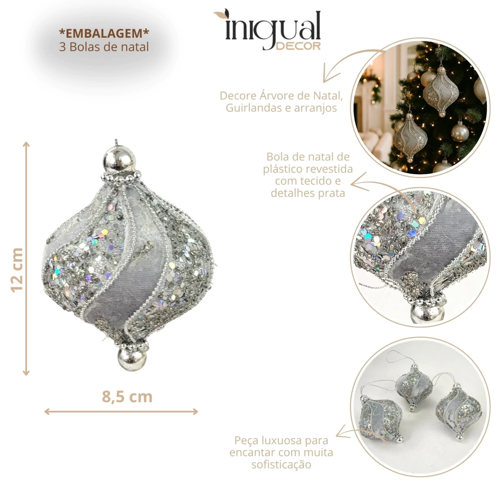 Kit 3 Bolas de Natal Prata com Tecido e Glitter – 12x8,5cm