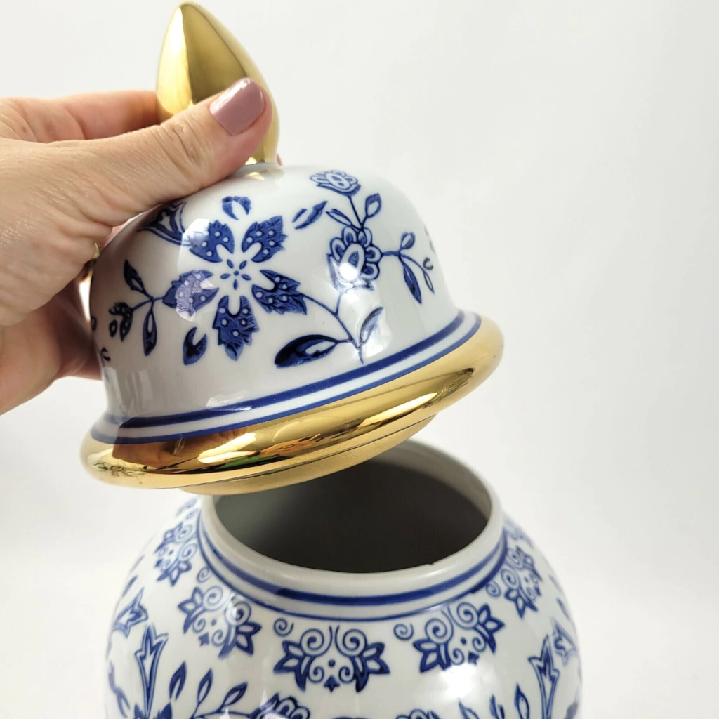 Habilmente trabalhado em porcelana de alta qualidade, este potiche apresenta um encantador padrão floral em tons de azul e branco, que evoca serenidade e sofisticação. Seu design imponente, com 36,0 cm de altura total (e 25,0 cm sem a tampa), 20 cm de largura e profundidade, e uma boca com diâmetro de 10,0 cm, o torna ideal para ser o destaque em aparadores, mesas de centro ou consoles amplos.