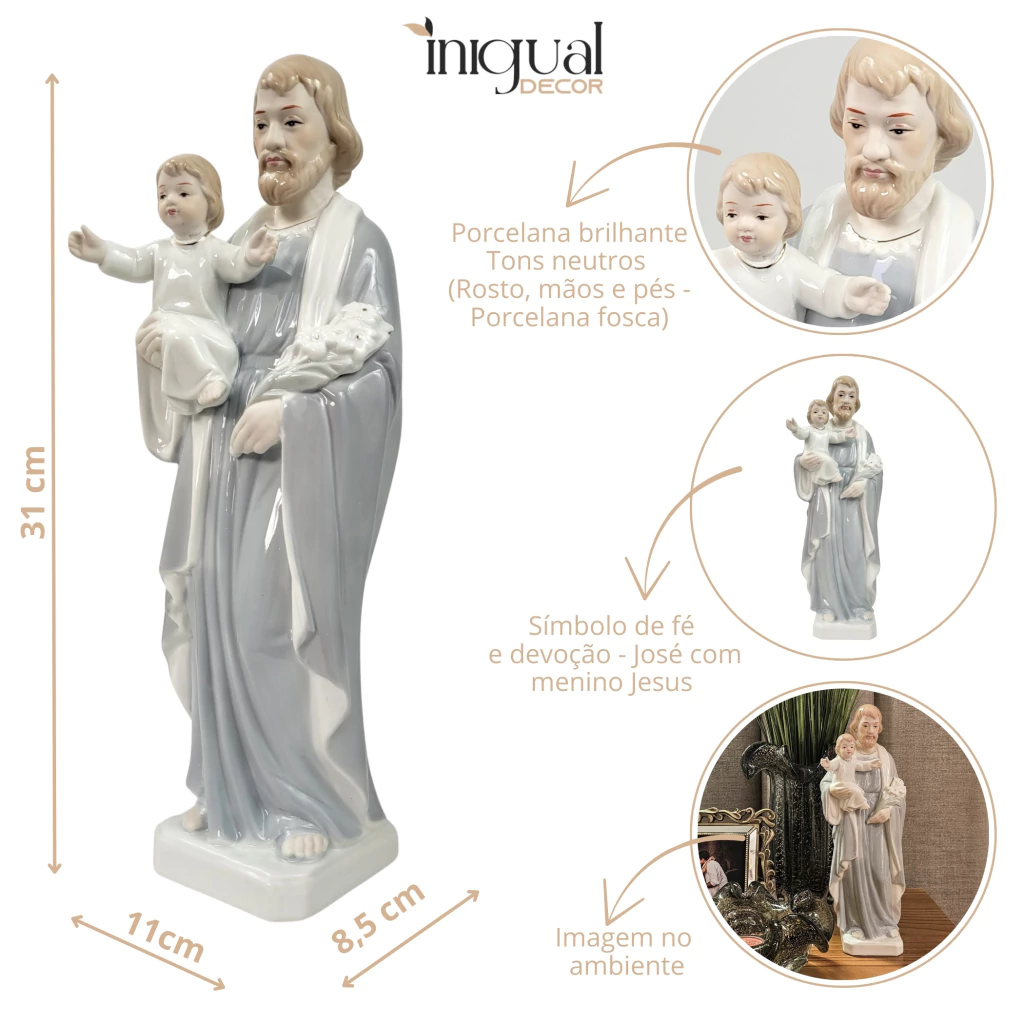 Confeccionada em porcelana com acabamento em cores neutras, a estátua possui um design que transmite uma sensação de pureza e dignidade. A delicadeza da porcelana realça os detalhes da escultura, capturando a cena de São José protegendo e segurando o Menino Jesus em seus braços. Com 31 cm de altura, ela tem o tamanho ideal para se destacar com discrição em uma estante, mesa ou altar, tornando-se um ponto de serenidade e devoção.